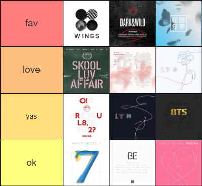 my top three BTS albums are Wings, Dark & Wild, and The Most Beautiful Moment In Life: Pt.2. for this ranking, i will be excluding albums that are basically combinations of two or just the same album, but with one more song. So Love Yourself: Answer, The Most Beautiful Moment in Life: Young Forever, and You Never Walk Alone. my reason for not including these in my ranking is because it makes more sense to me and feels more balanced. Like yeah Wings plus Spring Day would win etc. so i'm just not gonna count it...so yeah. i'll be going into depth for only my top six favorites! but before that i'll explain my reasoning for the other lower six rankings. bottom three ablums Map of the Soul: 7, BE, and Map of the Soul: Persona, are just not as good as their other albums sorry. while i love Map of the Soul: 7 for nostalgia, Filter, and My Time, it didn't make it. apologies to all BE and Persona lovers out their i don't gaf about those two albums. O!RUL8,2 was so close to being in my top six. Love Yourself: Tear i know is "logically" better than Her, but also i feel like it's better in every emotional way. Also Her means so much to me so. And 2 Cool 4 Skool i fucking love and i almost put it higher, but there's just not enough songs to compare against the others.